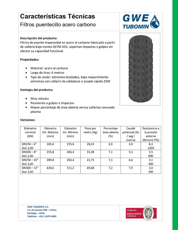 Tuberías y filtros de aceroCatálogos Catálogo Corporativo Descargar Acero Descargar Especificaciones Técnicas Acople dielectrico Descargar Cañerías de acero inoxidable Descargar Cañerías de acero al carbono Descargar Cañerías de acero ranurado plasma Descargar Filtros de ranura continua inoxidable Descargar Filtros puente trapezoidal acero al carbono Descargar Filtros puente trapezoidal acero inoxidable Descargar Filtros de ranura continua con recubrimiento hagulit Descargar Filtros puente trapezoidal con recubrimiento hagulit Descargar Filtros de ranura continua con recubrimiento hagulit Descargar