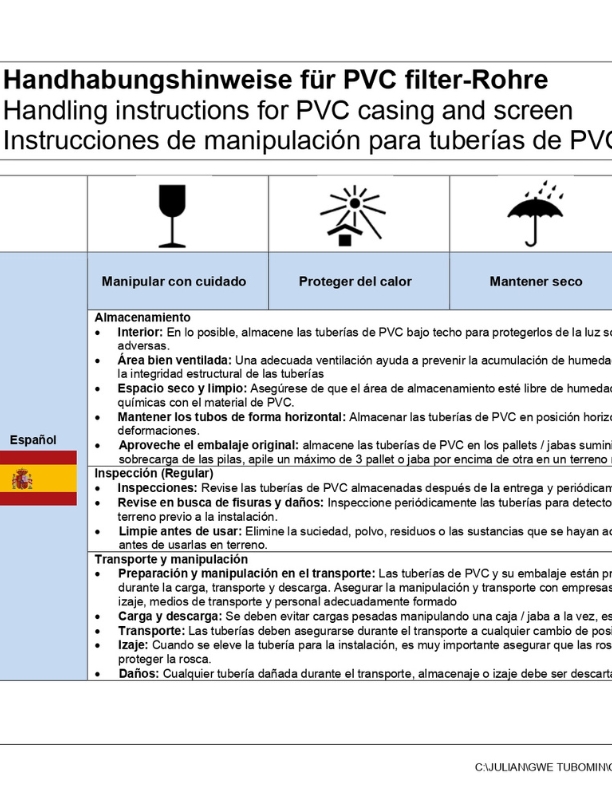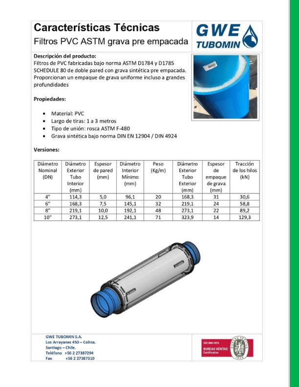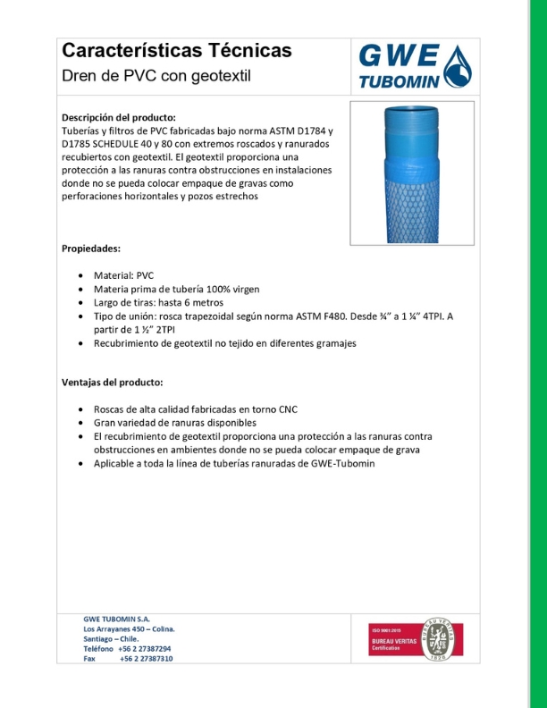 Tuberías y filtros de PVCCatálogos Catálogo Corporativo Descargar Instrucciones Descargar Especificaciones Técnicas Dren PVC con Geotextil Descargar Llave para Tuberías de PVC Descargar Prensa Ajustable Descargar PVC de presión unión NORESTA Descargar PVC Norma ASTM Descargar PVC Norma ASTM Doble Pared Descargar PVC Norma DIN Descargar PVC Norma DIN Grava pre empacada Descargar PVC Ranura continua Budafilter Descargar PVC unión SBF Norip Descargar Tapa de Pozo Descargar